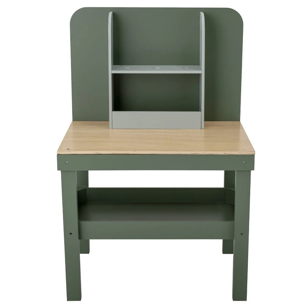 Deze groene werkbank nodigt uit om lekker te spelen! Natuurlijk bevat de werkbank alles om direct aan de slag te gaan. Een houten baco, hamer, schroevendraaier, zaag, liniaal, stanleymes, tang en lijmklem. Een extra plank onder de werkbank zorgt voor opbergruimte. De achterwand heeft een plank om het gereedschap op te ruimen.Â