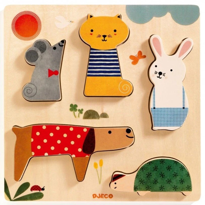Een houten DJECO puzzel met 5 huisdieren (puzzelstukken). Een muis, kat, konijn, schildpad en een hondje. Formaat puzzel 21 x 21 x 2.2 cm, verpakt in een stevige bewaardoos.