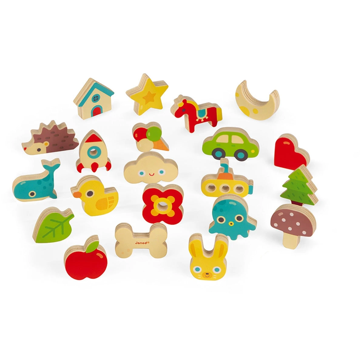 Janod houten memory spel ‘ik leer’ is een gezellig gezelschapsspel voor peuters en kleuters. steek je hand in de zak en vind als eerste de 4 vormpjes die op de kartonnen speelkaart staan.