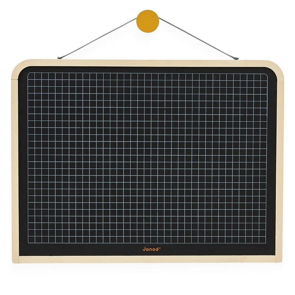 JANOD dubbelzijdig schoolbord om op te hangen. Het schoolbord van 60 x 45 cm heeft 1 schoolbord zijde en een zijde met ruitjes. Gebruik de ruitjes om sommen op maken of om via de lijntjes een mooie tekening te maken.Â