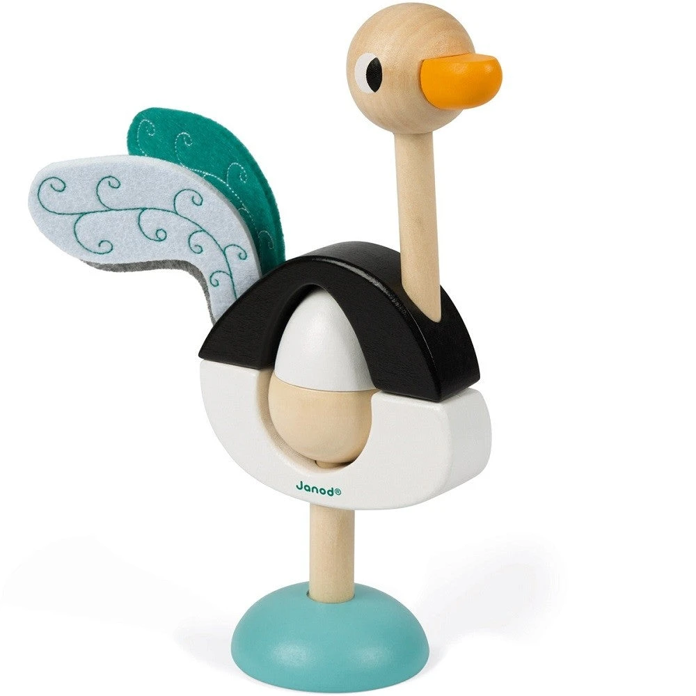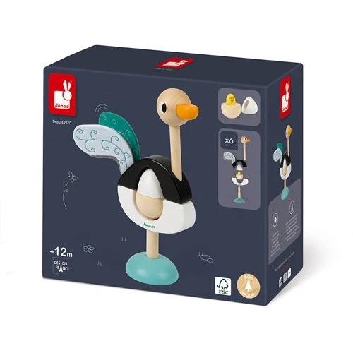 Houten stapeltoren van JANOD in de vorm van een prachtige struisvogel. Dit houten speelgoed is een origineel kraamcadeau en bestaat uit 6 in elkaar te zetten grote stukken om de struisvogel te maken. Maar waar is het kleine struisvogelkuiken? Die zit lekker warm verstopt in het ei.