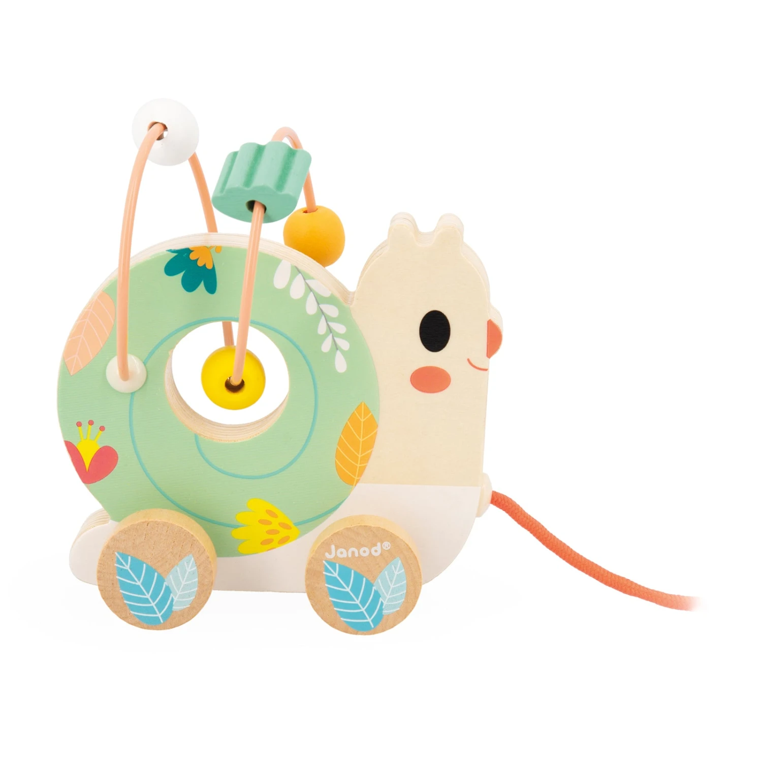 JANODÂ trekfiguur slak met een kralenframe met 4 kralen. Een houten speelgoed trekfiguur om de eerste stapjes van je kindje te stimuleren. Trek de slak achter je aan aan het koraalroze touw. Klaar met wandelen? Dan kun je de kralen over het frame laten glijden, de kracht van herhaling zorgt ervoor dat kinderen dit eindeloos kunnen doen.Â