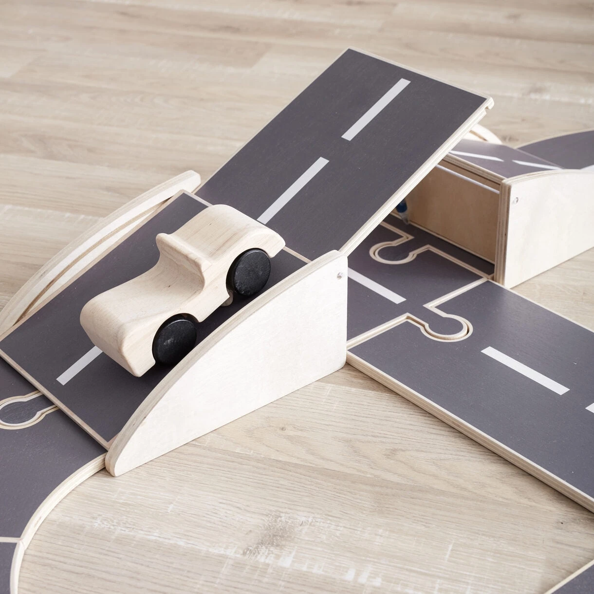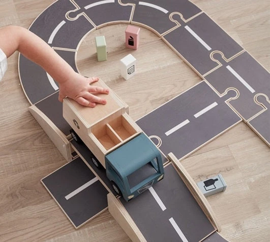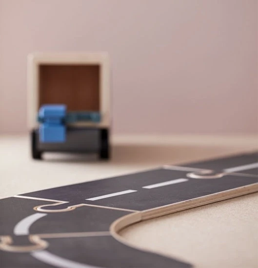 Kids Concept autobaan met een beweegbare brug. De houten autobaan bestaat uit 18 stukken die je op allerlei manieren kan leggen zoals jij wilt dat de route gaat.