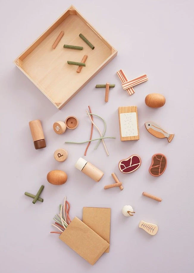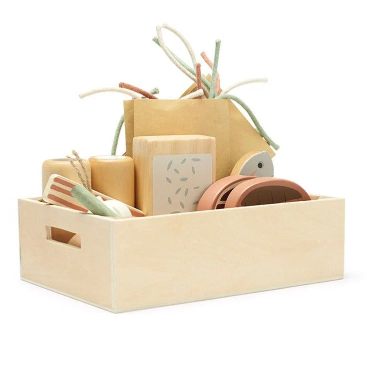 Bereid voortaan de heerlijkste gerechten in jouw speelgoedkeukentje, of open een restaurantje. Met deze ingrediënten voor de heerlijkste maaltijden schuiven jouw gasten heel graag aan. De set zit verpakt in een houten kratje van 24 x 19 x 5 cm en bevat de volgende onderdelen: