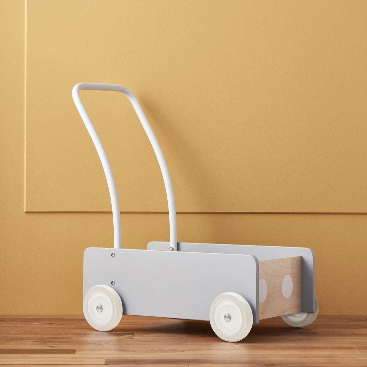 Kids Concept loopwagen is een grijze loopwagen met witte wielen om je peuter te ondersteunen bij het zetten van de eerste stapjes en natuurlijk om lekker veel speelgoed in te bewaren en rond te rijden.