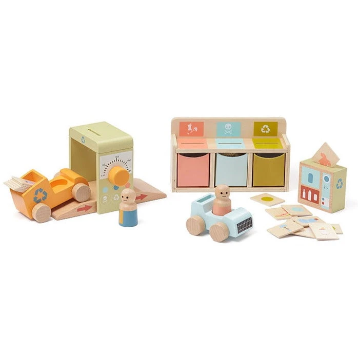 Kids Concept recycle station, bezoek het vuilnisstation en laat de bezoekers het afval scheiden. Zet de auto voor en na het bezoek op de weegbrug, net als bij een echte vuilnisbelt. Het afval scheidt je in de 3 verschillende containers. Kun je het vuilnis niet wegbrengen? Dan gebruik je de vuilniswagen en haal je het op!