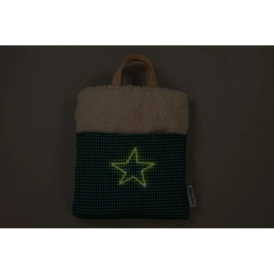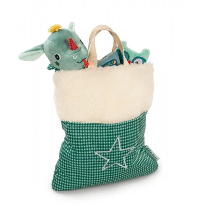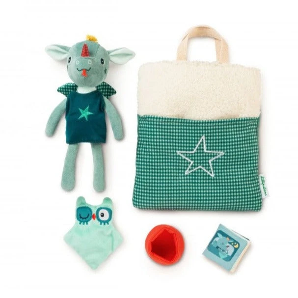 De set bestaat uit een drakenknuffel van 10 x 22 cm en een tas van 19 x 24 cm. In de tas zitten een potje, pyama, luier, knuffeldoekje en boekje, allemaal van stof. De voorkant van de tas gebruik je als bedje voor Joe. De ster op de voorkant geeft licht in het donker.Ā