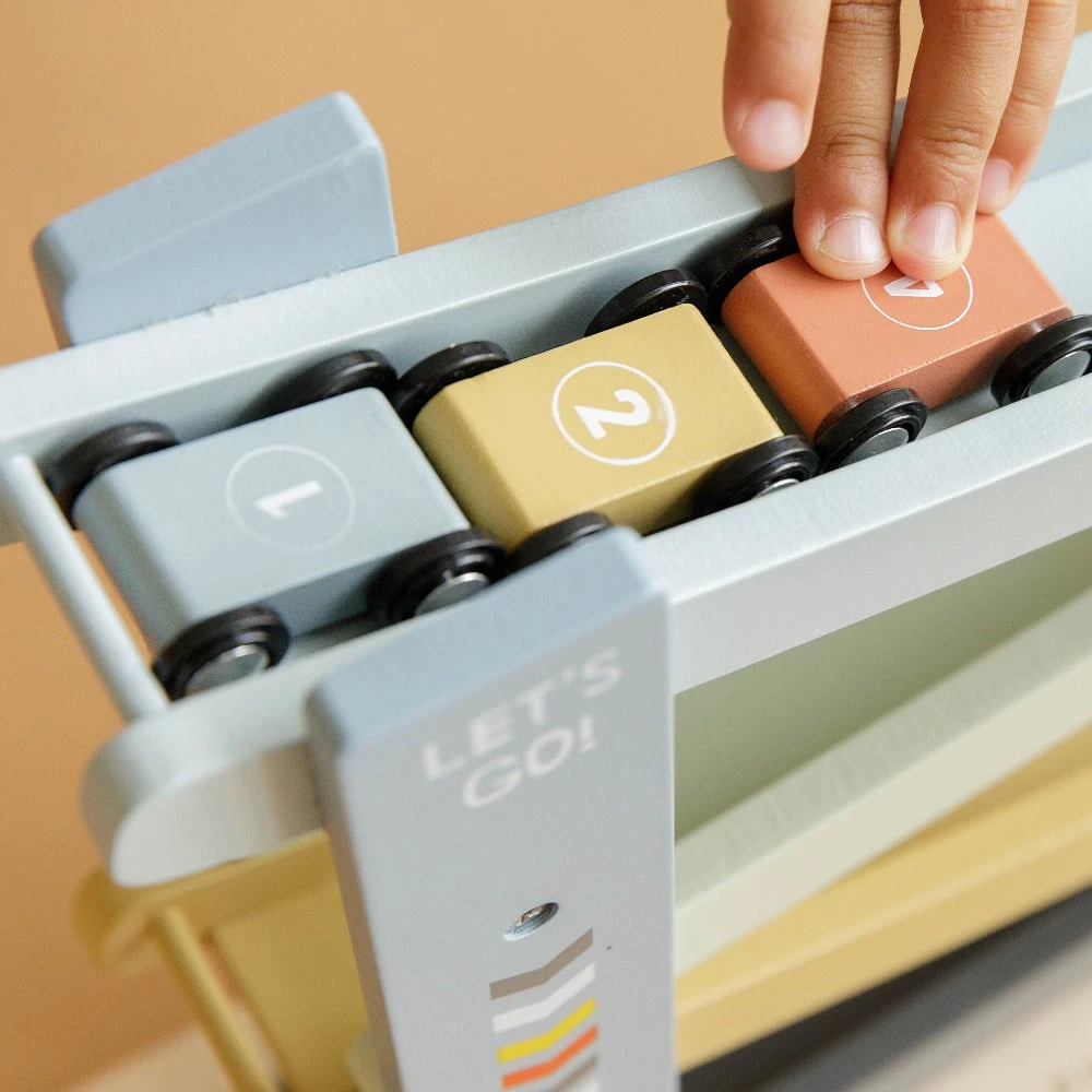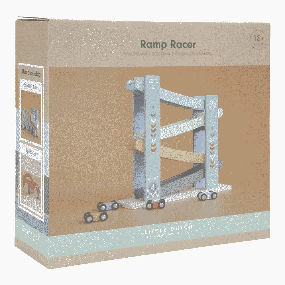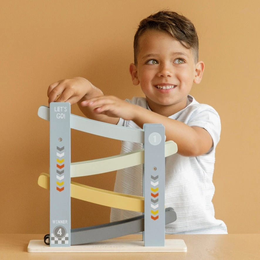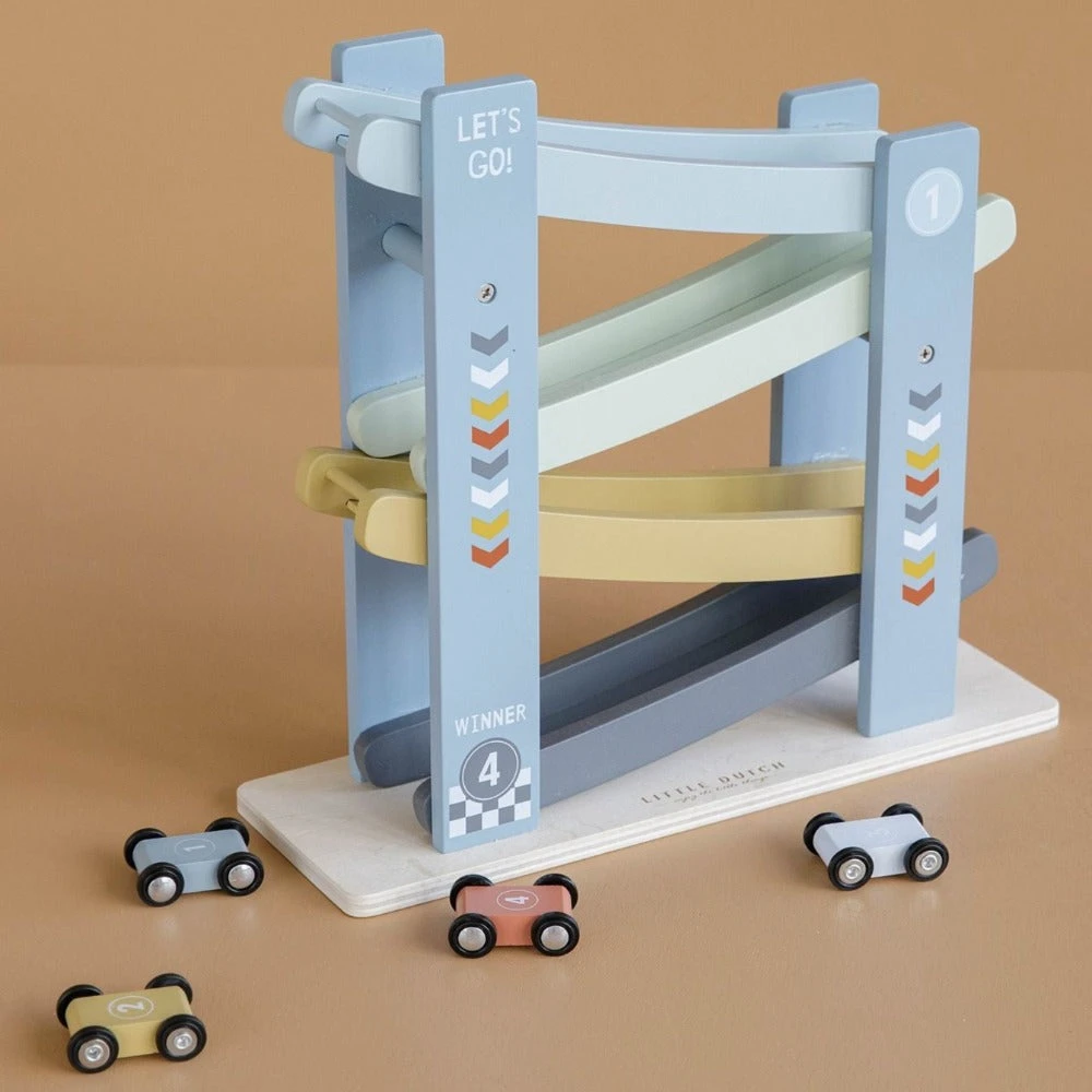 Little Dutch autobaan, laat je speelgoed auto’s keer op keer naar beneden racen. De blauwe autobaan wordt geleverd met 4 autootje in verschillende kleuren: blauw, roest, lichtblaw en geel. Peuters vanaf 18 maanden kunnen eindeloos spelen met de speelgoed autobaan,