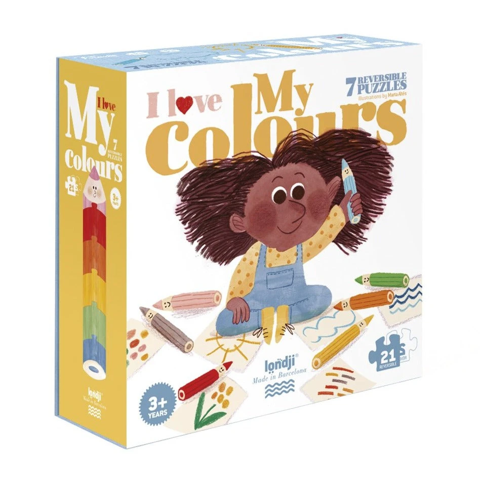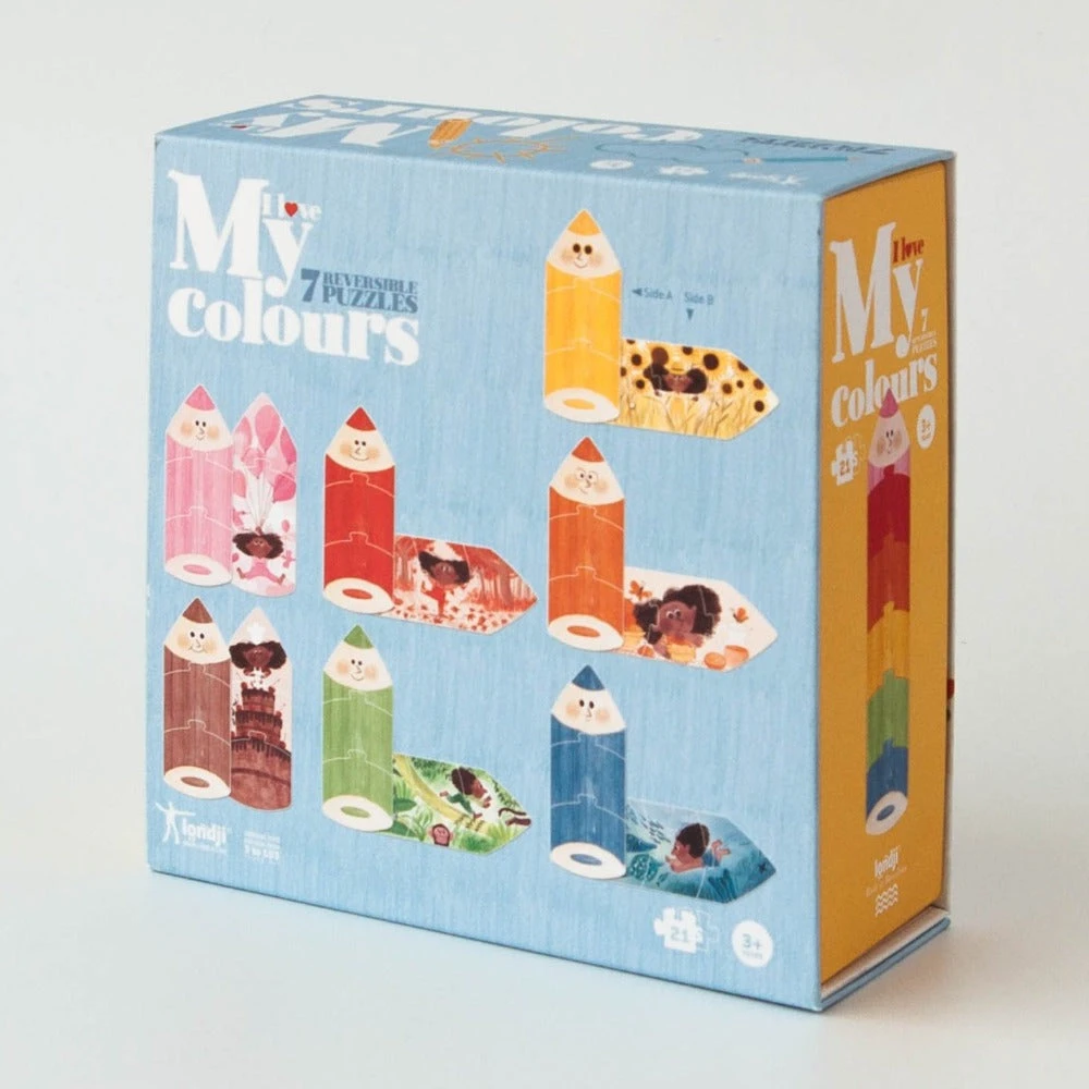 Een eerste puzzel van LONDJI met kleuren thema is een puzzel voor peuters vanaf 3 jaar. De kinderpuzzel met 21 grote stukken vormen samen 7 puzzels. Dubbelzijdig bedrukt dus maar liefst 14 puzzels in totaal!Â
