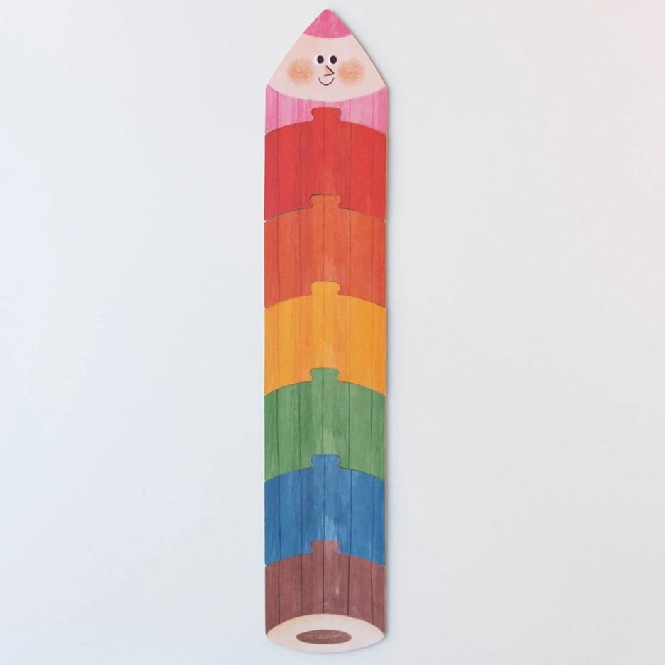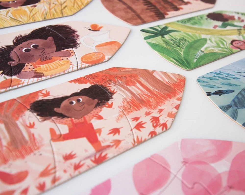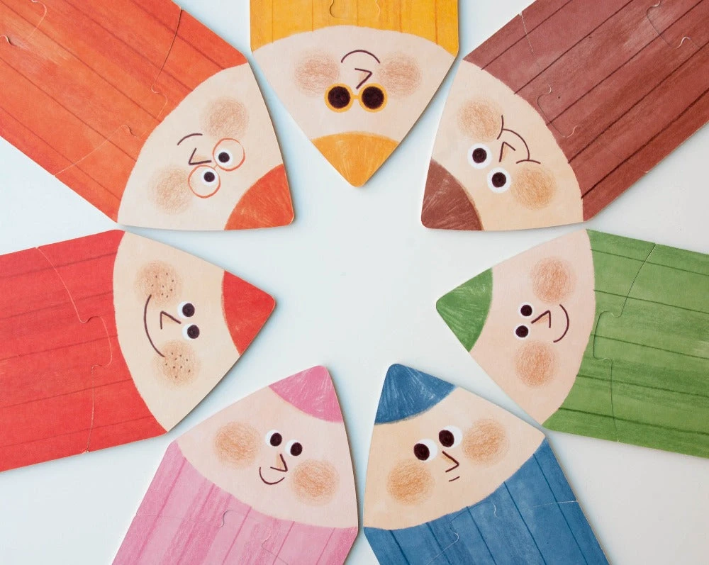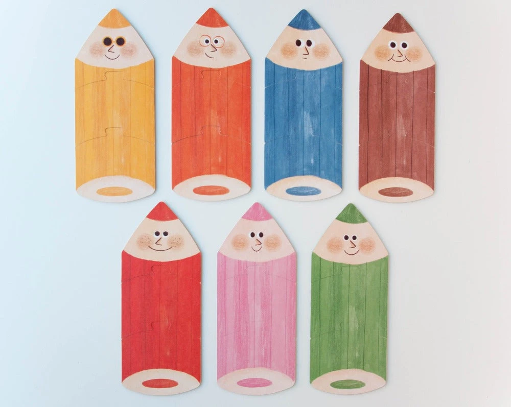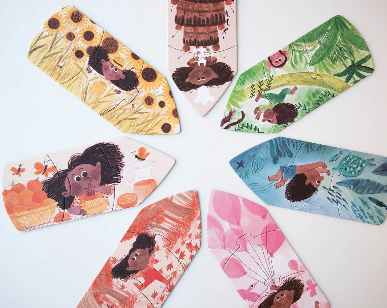 De puzzels van I love my colours zijn extra groot, 7 x 13 cm, heel geschikt om zelf te leren puzzelen. Leg 3 puzzelstukken aan elkaar en vorm zo 7 verschillende kleuren potloden. De puzzel is aan beide zijden bedrukt. Aan 1 zijde leg je het potlood aan de andere zijde zie je een meisje in een gekleurde omgeving. Ze zweeft aan roze ballonnnen door de lucht en zwemt n een blauwe zee.