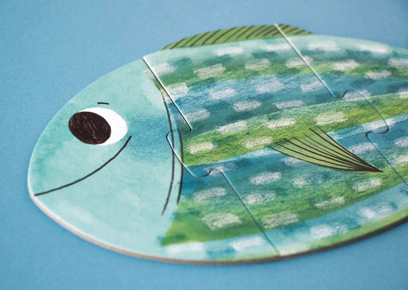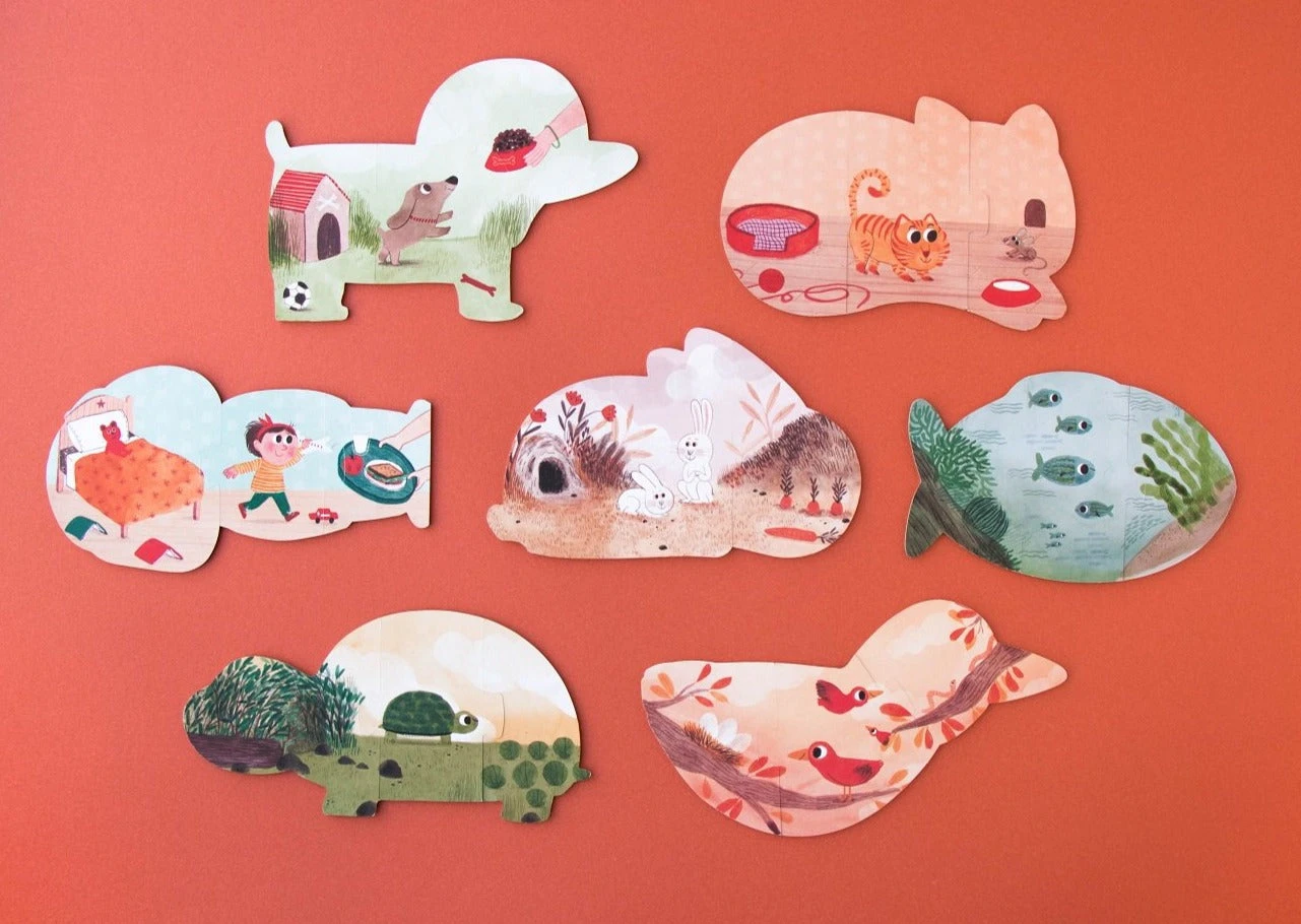 De puzzels van I love my pets zijn extra groot, 7 x 13 cm, heel geschikt om zelf te leren puzzelen. Leg 3 puzzelstukken aan elkaar en vorm zo 7 verschillende huisdieren. De puzzel is aan beide zijden bedrukt. Aan 1 zijde leg je het huisdier, aan de andere zijde zie je het huisdier in zijn omgeving. De kat en hond worden gevoerd, de vis zwemt in het water.Â
