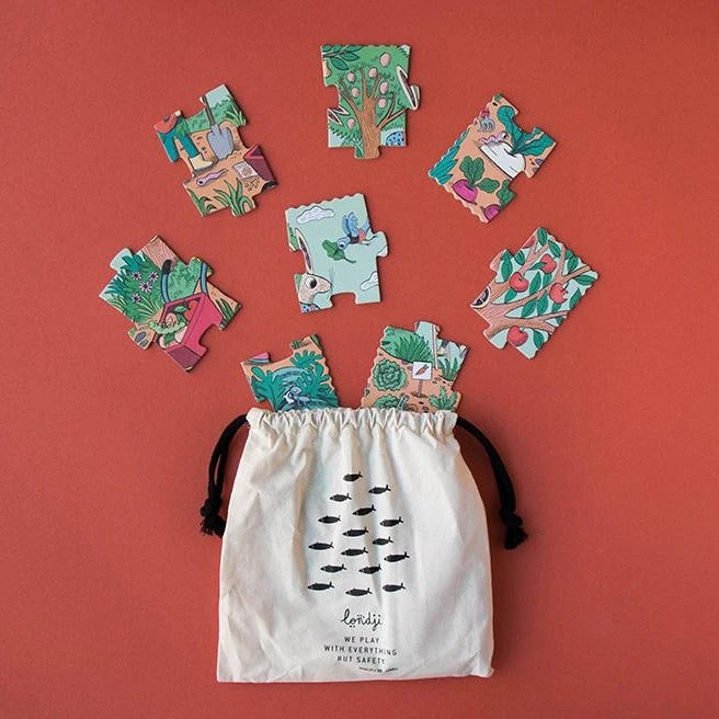 Met de 24 grote puzzelstukken van 7 x 10 cm leg je een puzzel met de moestuin van het konijn. Al zijn vrienden hebben een taak: peren plukken, en water geven. Gebruik de zoekkaartjes om 24 details op de puzzel terug te zoeken.   Formaat van de puzzel is 60 x 30 cm. Geprint met bio inkt op gerecycled karton, een bewuste keus, de puzzel is volledig recyclebaar.