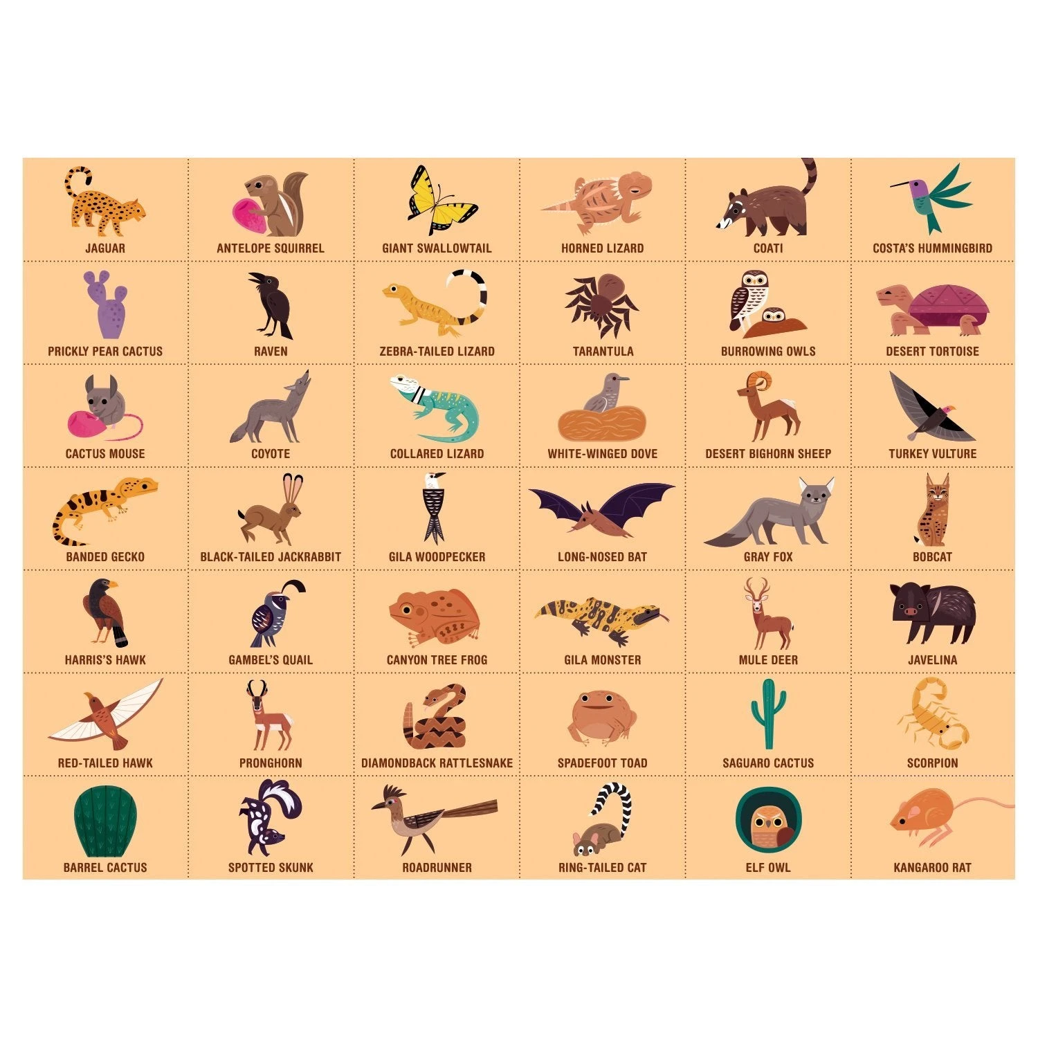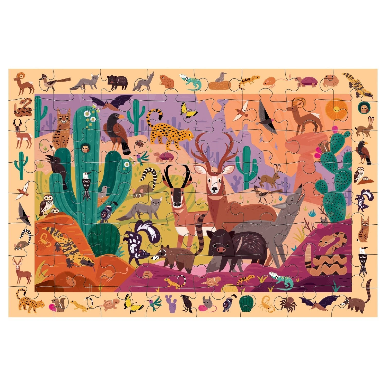 Een leerzame Mudpuppy observatiepuzzel woestijn met in de randen allerlei dieren uit de woestijn in het zuidwesten van Amerika. Een kinderpuzzel met 64 stukjes, geschikt voor kinderen vanaf 4 jaar.