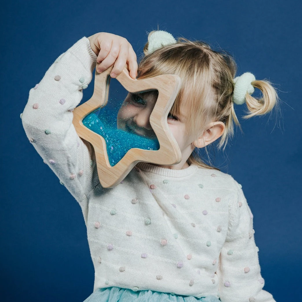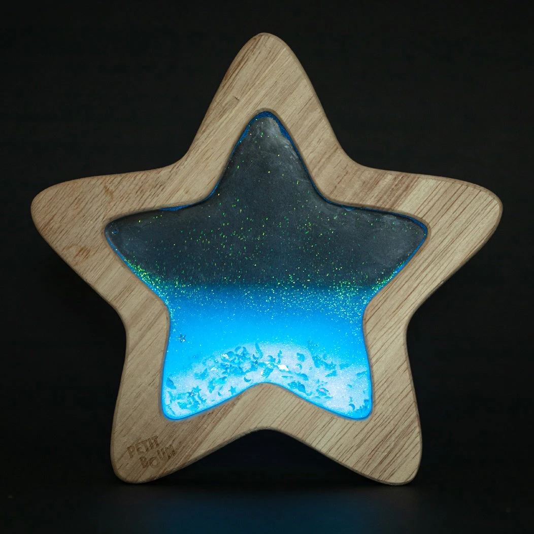 Petit Boum sensorische ster Orionis, beweeg de ster en ontspan terwijl de glow in the dark sterren, planeten, raketten en glitters langzaam heen en weer vloeien. Dit houten speelgoed is geschikt voor kinderen vanaf 6 maanden.