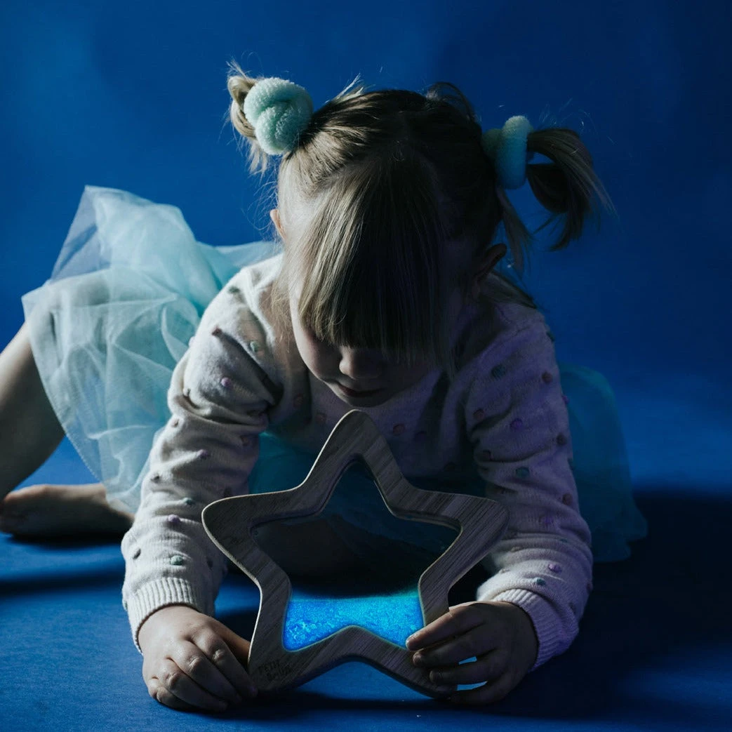 Sensorisch speelgoed stimuleert de zintuigen. Door te kijken naar de vloeiende bewegingen van de inhoud van de ster raak je ontspannen. In het donker geven de raketten, planeten, sterren en de groene glittervulling licht. Prachtig om naar te kijken en lekker bij in slaap te vallen.