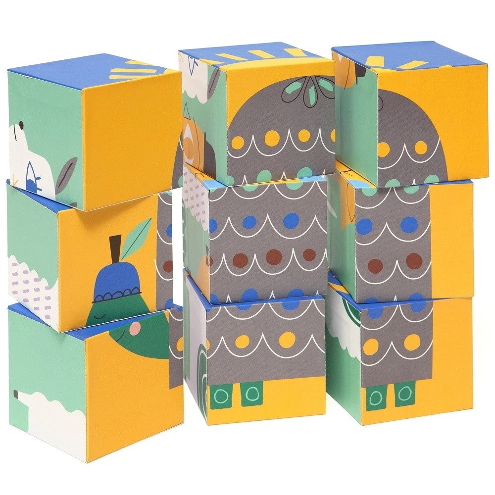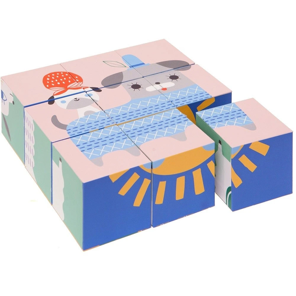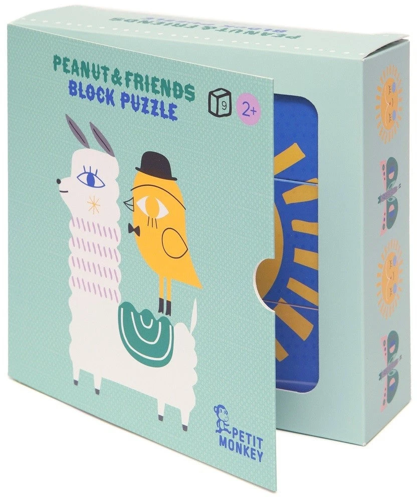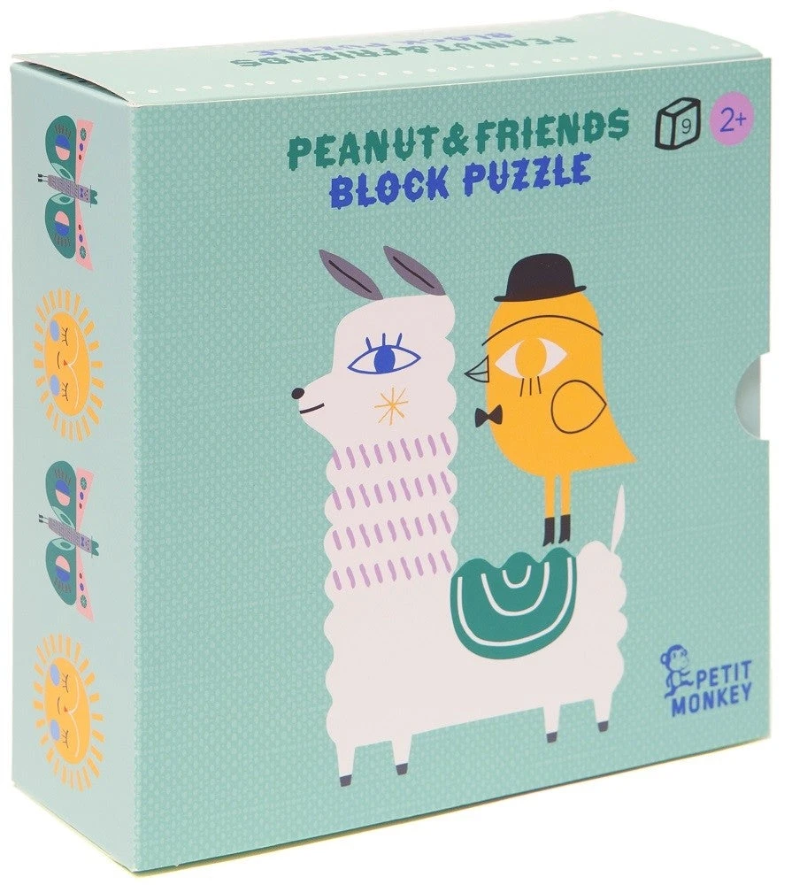 Petit Monkey blokpuzzel Peanut & Friends. De 9 stevige kartonnen blokken hebben het perfecte formaat voor peuters, 6 x 6 x 6 cm makkelijk om vast houden.