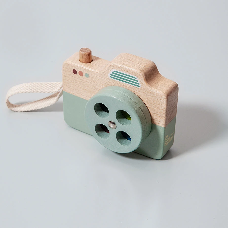 Een blauwe houten speelgoed camera van Petit Monkey met een gekleurde lenzen voor peuters en kleuters vanaf 3 jaar. “Create your own reality”, pretend play stimuleert de fantasie van kinderen!Â