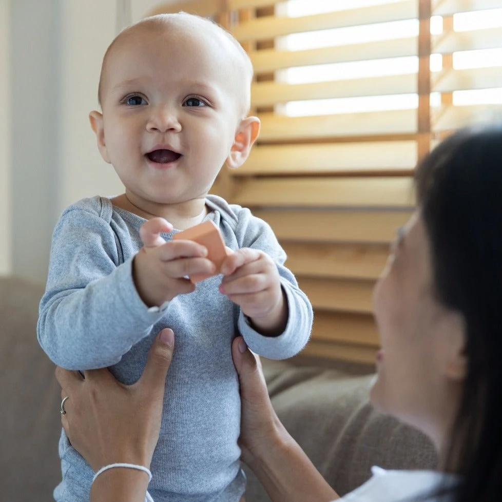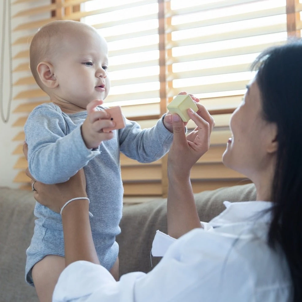 Plan Toys sensory blocks, elk van de 6 houten babyblokken heeft een andere mooie pastelkleur en functie, een houten blok met een spiegel, een met kaleidoscoop en natuurlijk zijn er ook blokjes met geluid.