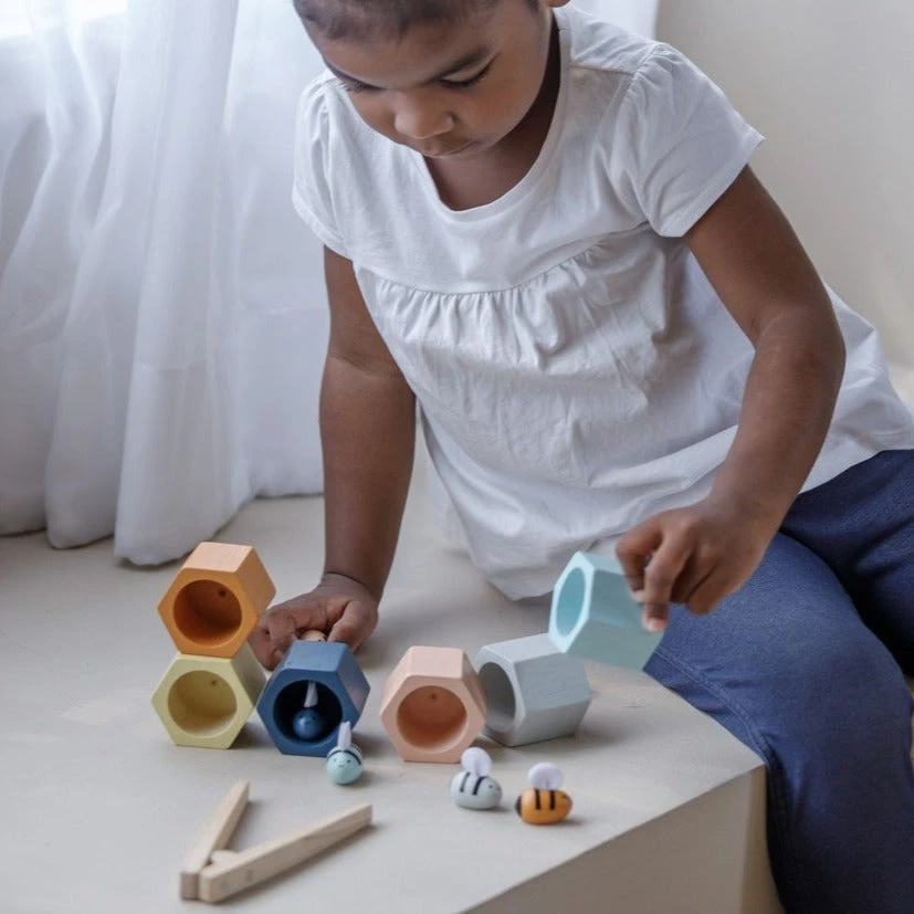 Plan Toys bijenkorf spel is een behendigheidsspel om de fijne motoriek van peuters te stimuleren. Een leuk spel voor peuters om alleen te spelen. Gebruik de pincet om de bij in de bijenkorf van zijn kleur te plaatsen.Â