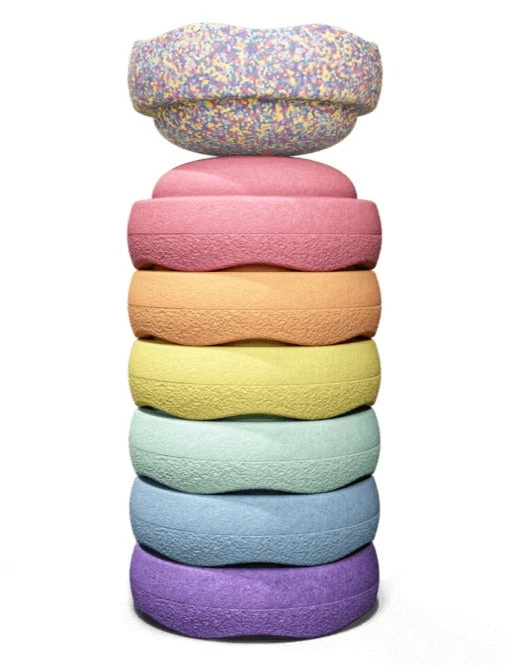 Stapelstein pastel stapelstenen regenboog nodigen je kindje uit om lekker te bewegen. Een pastel set van 6 Stapelstein stenen: in koraal, mango, zonnegeel, lichtblauw, jeans en paars en 1 extra pastel confetti steen. Een prachtige set om lekker mee van start te gaan. Bouw, spring, wiebel en speel met deze regenboog set en maak een regenboog,Â