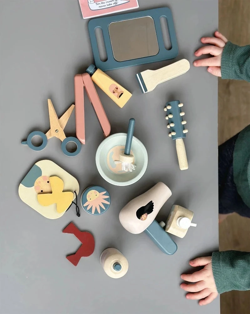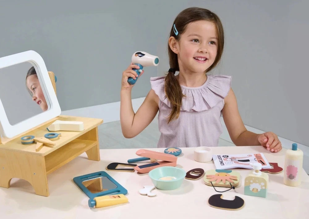 Tender Leaf toys kiapsalon, een kaptafel met spiegel en een complete kappersuitrusting. Rollenspel speelgoed voor kinderen vanaf 3 jaar. Vanaf nu zit het haar van je poppen en knuffels altijd perfect!