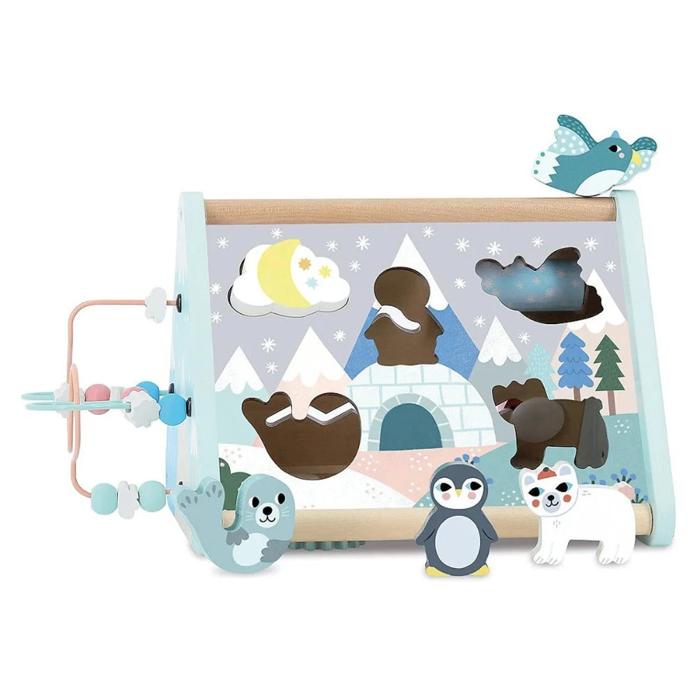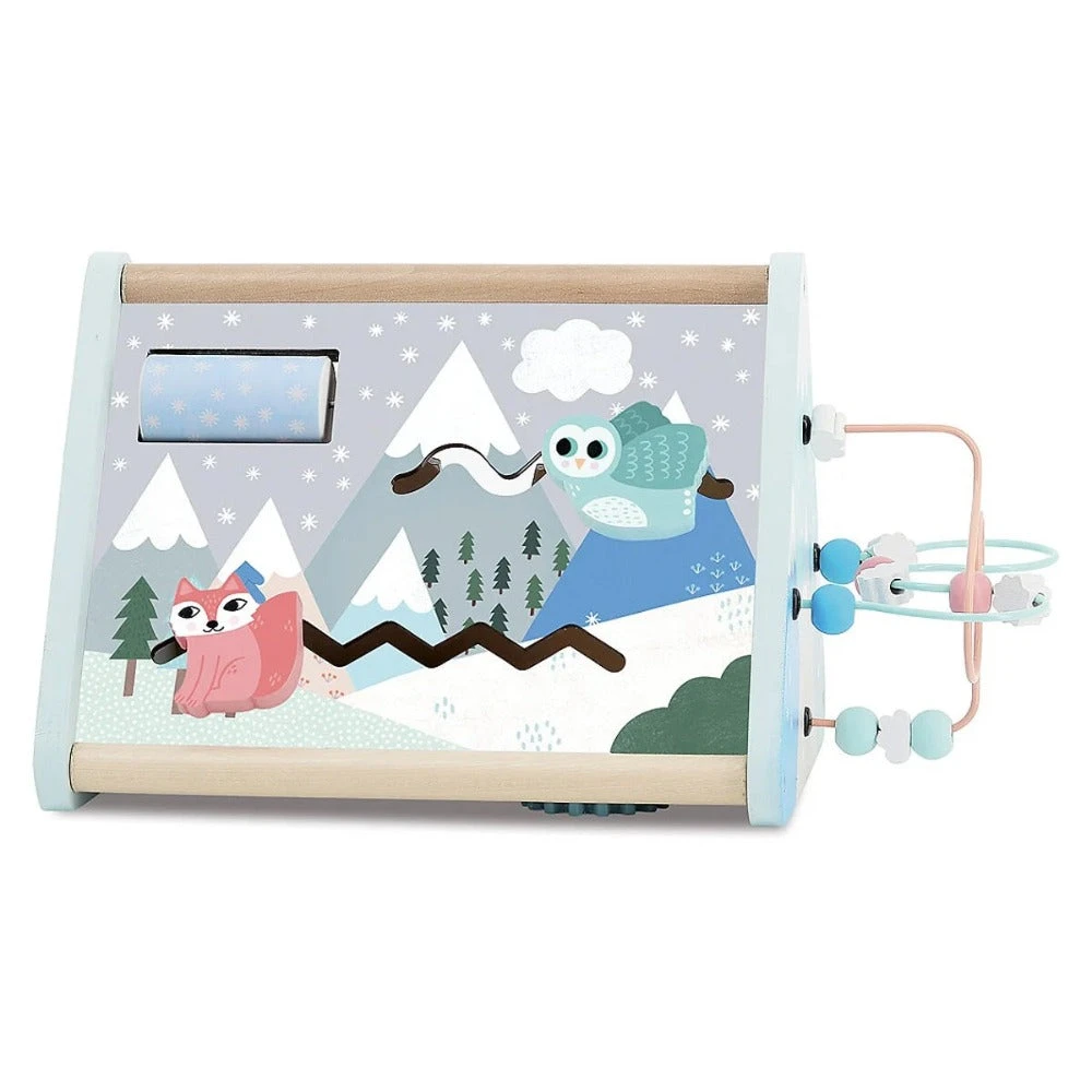 VILAC activiteiten speelgoed met een kralenframe en 3 kanten om te ontdekken.  Puzzel, draai en schuif en ontdek steeds een nieuwe activiteit. Dit speelgoed voor kinderen vanaf 1 jaar daagt je kindje uit en stimuleert de motoriek.