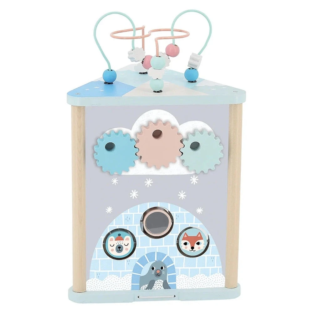 Zet de driehoek rechtop en schuif de kralen over het frame. De zijkanten van dit activiteitenspeelgoed hebben allemaal verschillende activiteiten. Draai aan de raderen en voel de verschillende texturen van de dieren. Puzzel met de 5 grote dieren en schuif de uil en de vos over hun parcours.